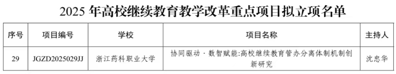 近日,浙江省教育厅公布2025年高等职业教育和高校继续教育教学改革项目立项结果,我校“协同驱动·数智赋能:高校继续教育管办分离体制机制创新研究”等6个项目成功入选,彰显学校在职业教育与继续教育教学改革领域扎实成效,是学校提升育人质量、深化教学改革重要成果。